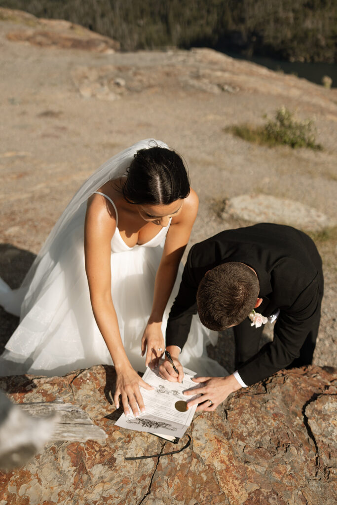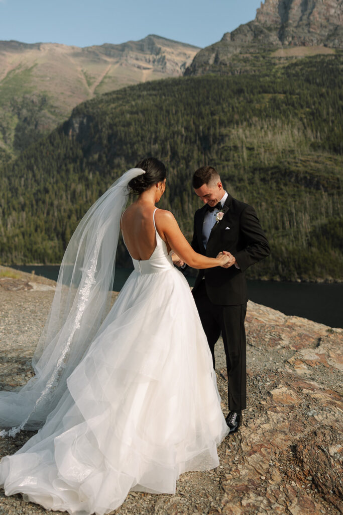 For their ceremony, we climbed up onto the large rock at the overlook. From that vantage point, everything opened up around us. The lake stretched far into the distance while the mountains rose in every direction. The light also played such a big role. Although the sun had not fully set yet, it had already softened into that creamy evening glow Glacier is known for! Because of that, the light wrapped gently around the mountains and reflected across the water. It created the most romantic atmosphere for their vows!